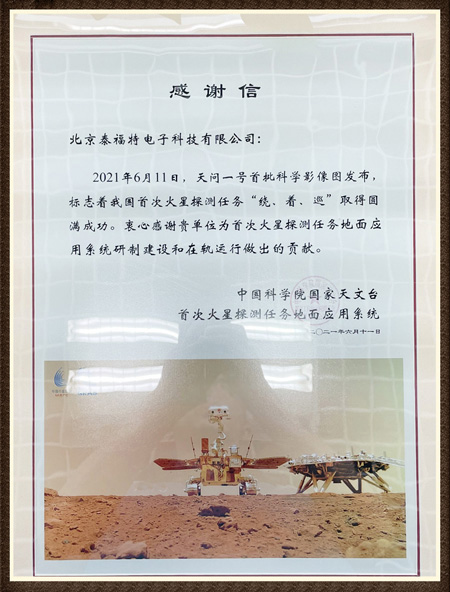 2021年6月11日,天問一號首批科學(xué)影像圖發(fā)布,標(biāo)志著我國***火星探測任務(wù)“繞、著、巡”取得圓滿成功。衷心感謝貴單位為***火星探測任務(wù)地面應(yīng)用系統(tǒng)研制建設(shè)和在軌運行做出的貢獻(xiàn)!