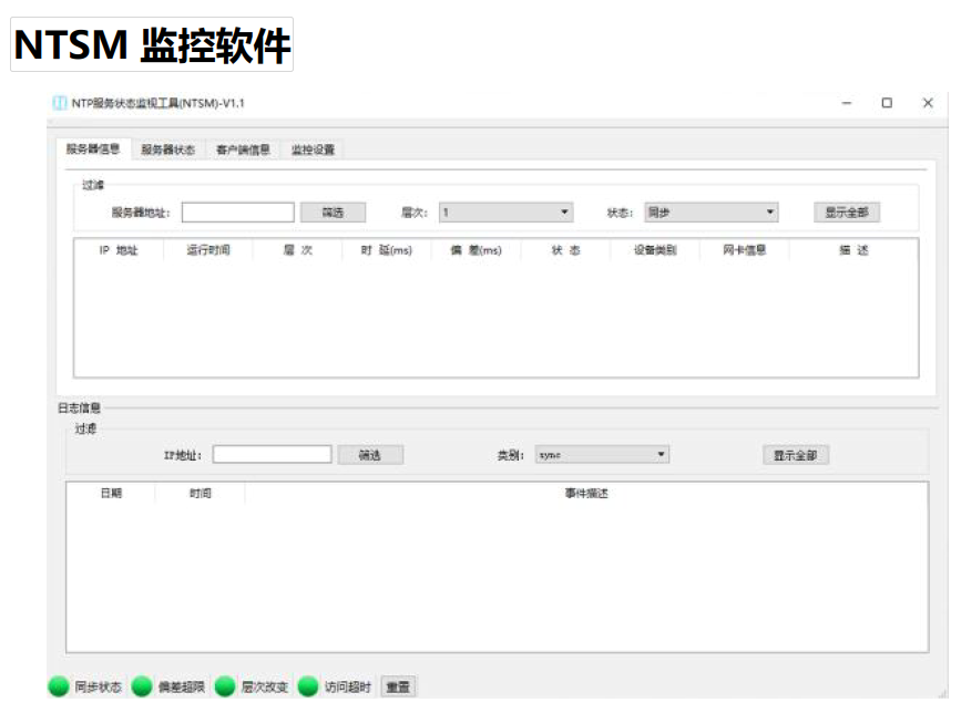 ◆用于對設(shè)備中NTP服務(wù)的詳細(xì)監(jiān)控; ◆可監(jiān)視服務(wù)器自身的狀態(tài)信息,包括同步狀態(tài)、時間偏差、層次信息等; ◆可監(jiān)視衛(wèi)星參考源信息,包括鎖定狀態(tài)、定位信息等; ◆可監(jiān)視NTP客戶端訪問情況和時間偏差; ◆支持時間偏差門限告警、失鎖告警和狀態(tài)切換告警; ◆支持SNMP、SYSLOG、EMAIL等告警方式。