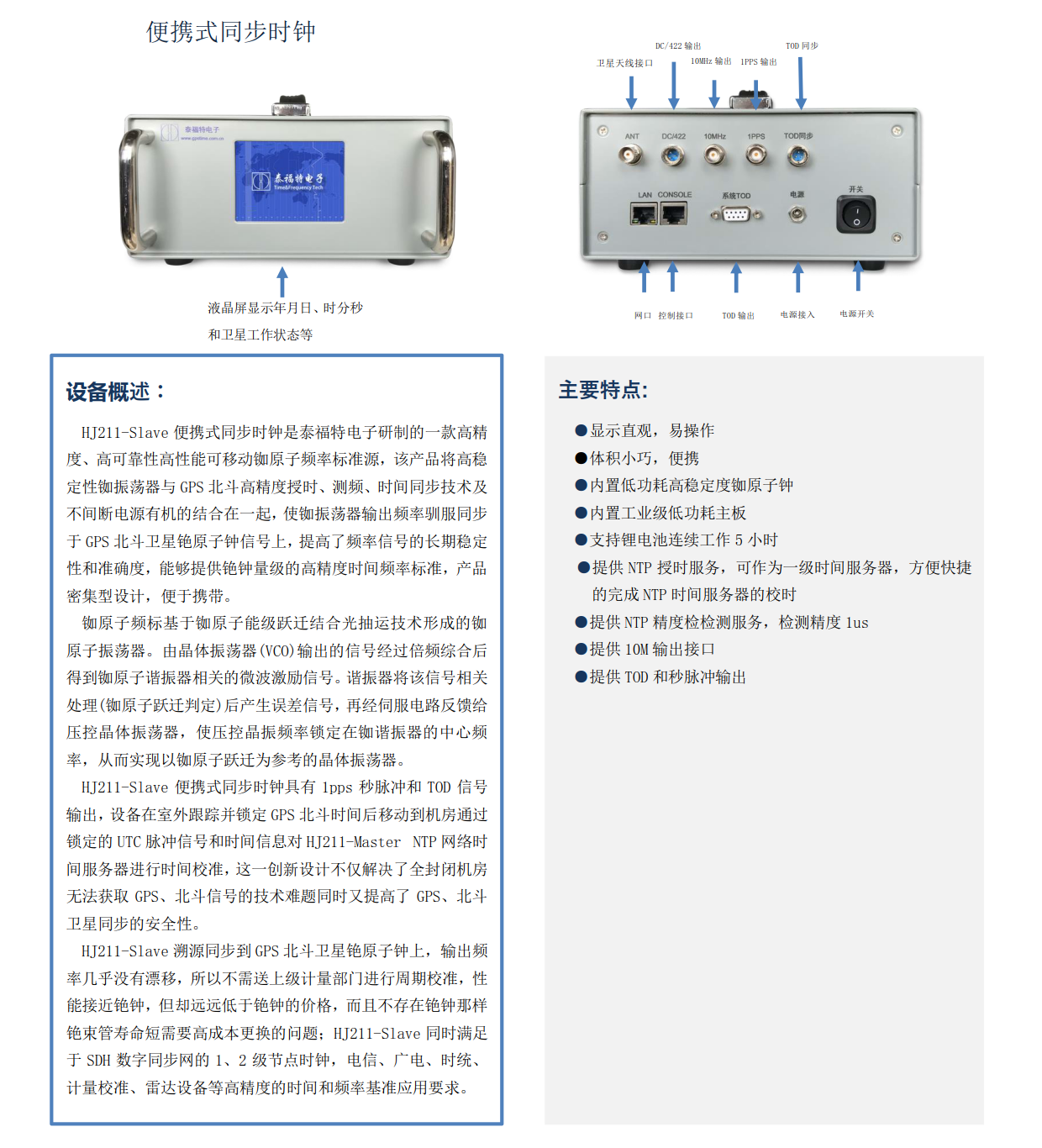HJ211-Slave便攜式同步時鐘是泰福特電子研制的一款高精度、高可靠性高性能可移動銣原子頻率標準源,該產(chǎn)品將高穩(wěn)定性銣振蕩器與GPS北斗高精度授時、測頻、時間同步技術(shù)及不間斷電源有機的結(jié)合在一起,使銣振蕩器輸出頻率馴服同步于GPS北斗衛(wèi)星銫原子鐘信號上,提高了頻率信號的長期穩(wěn)定性和準確度,能夠提供銫鐘量級的高精度時間頻率標準,產(chǎn)品密集型設(shè)計,便于攜帶。...