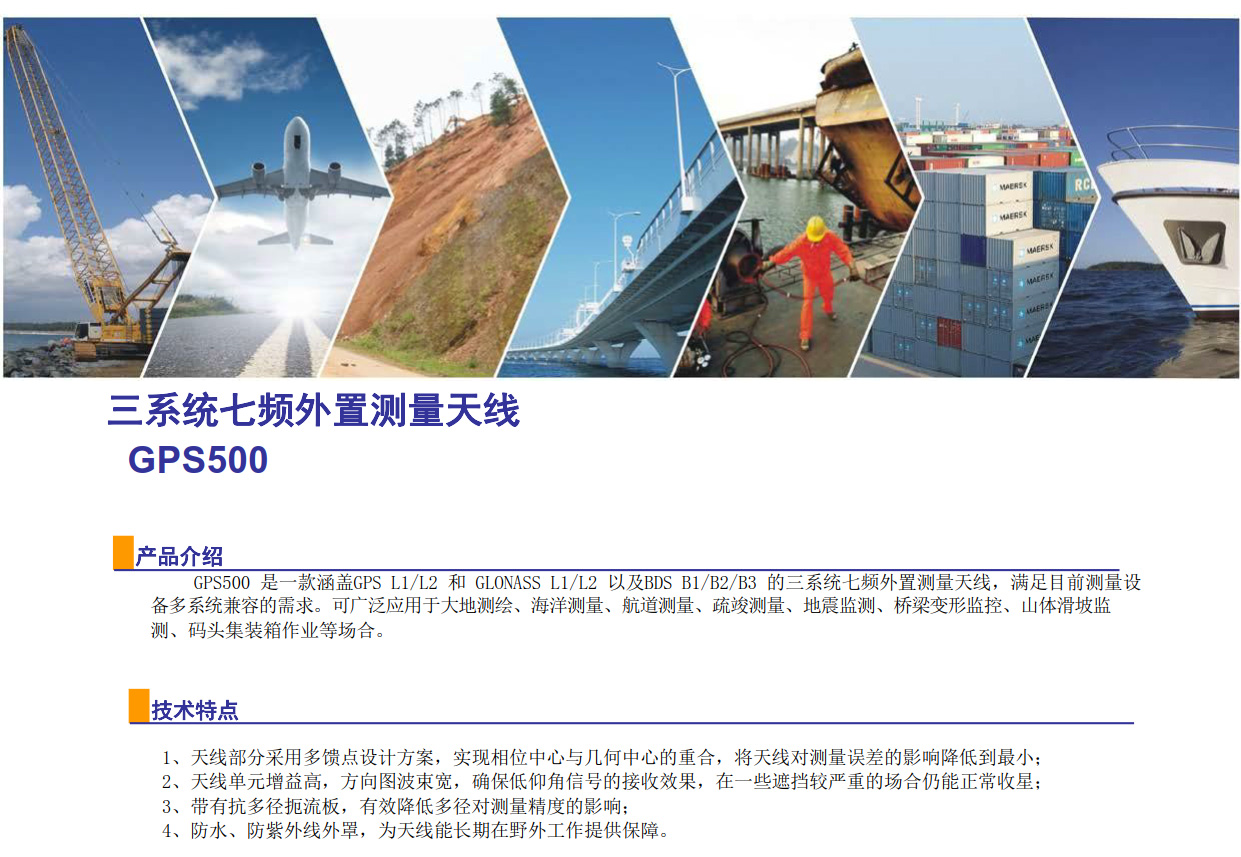 GPS500 是一款涵蓋GPS L1/L2 和 GLONASS L1/L2 以及BDS B1/B2/B3 的三系統(tǒng)七頻外置測(cè)量天線,滿足目前測(cè)量設(shè)備多系統(tǒng)兼容的需求??蓮V泛應(yīng)用于大地測(cè)繪、海洋測(cè)量、航道測(cè)量、疏竣測(cè)量、地震監(jiān)測(cè)、橋梁變形監(jiān)控、山體滑坡監(jiān)測(cè)、碼頭集裝箱作業(yè)等場(chǎng)合。...